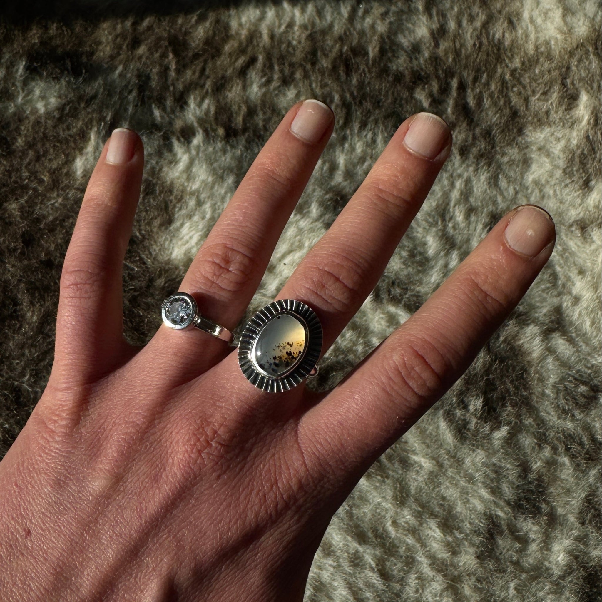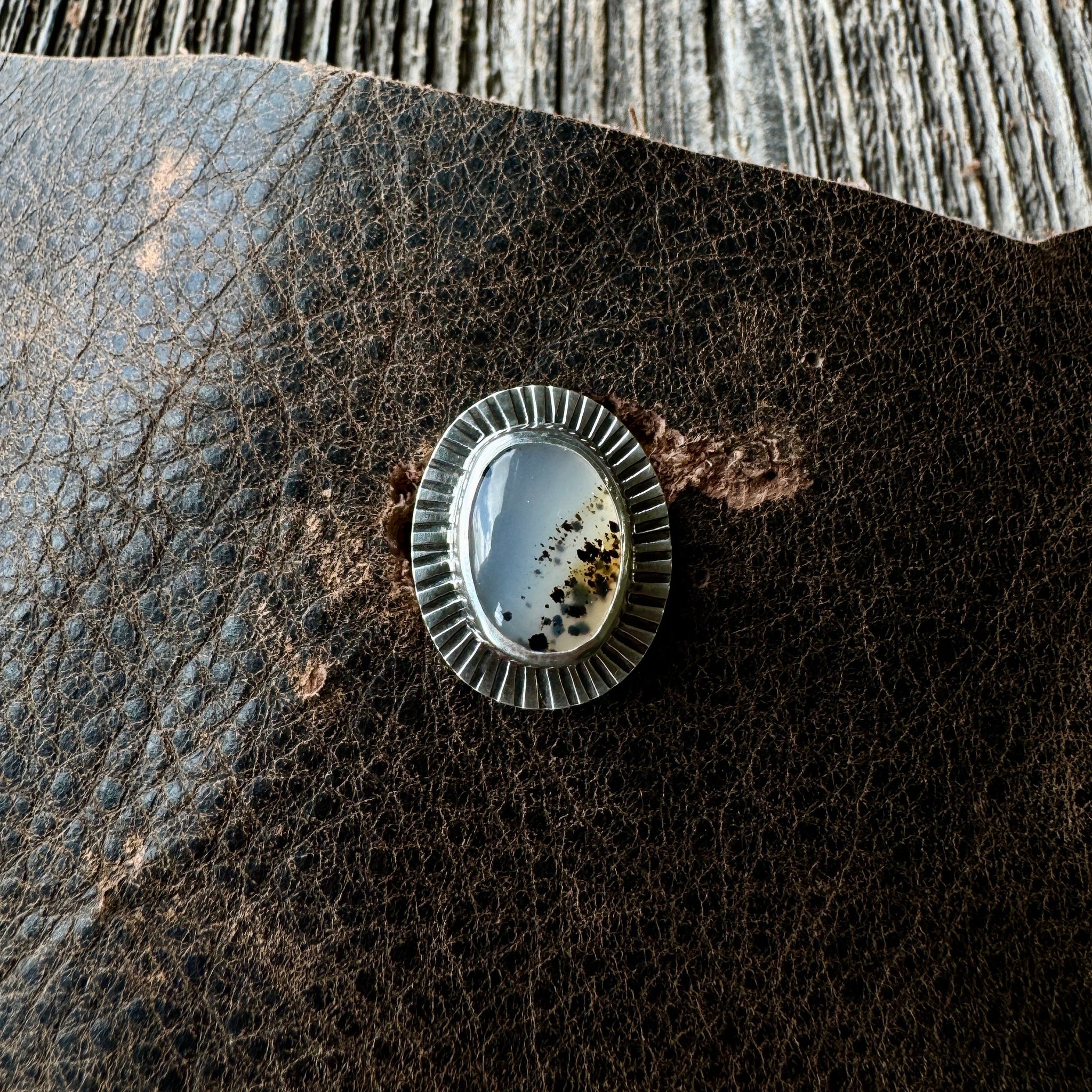 A gorgeous glowy Montana agate set in sterling silver with hand stamped details