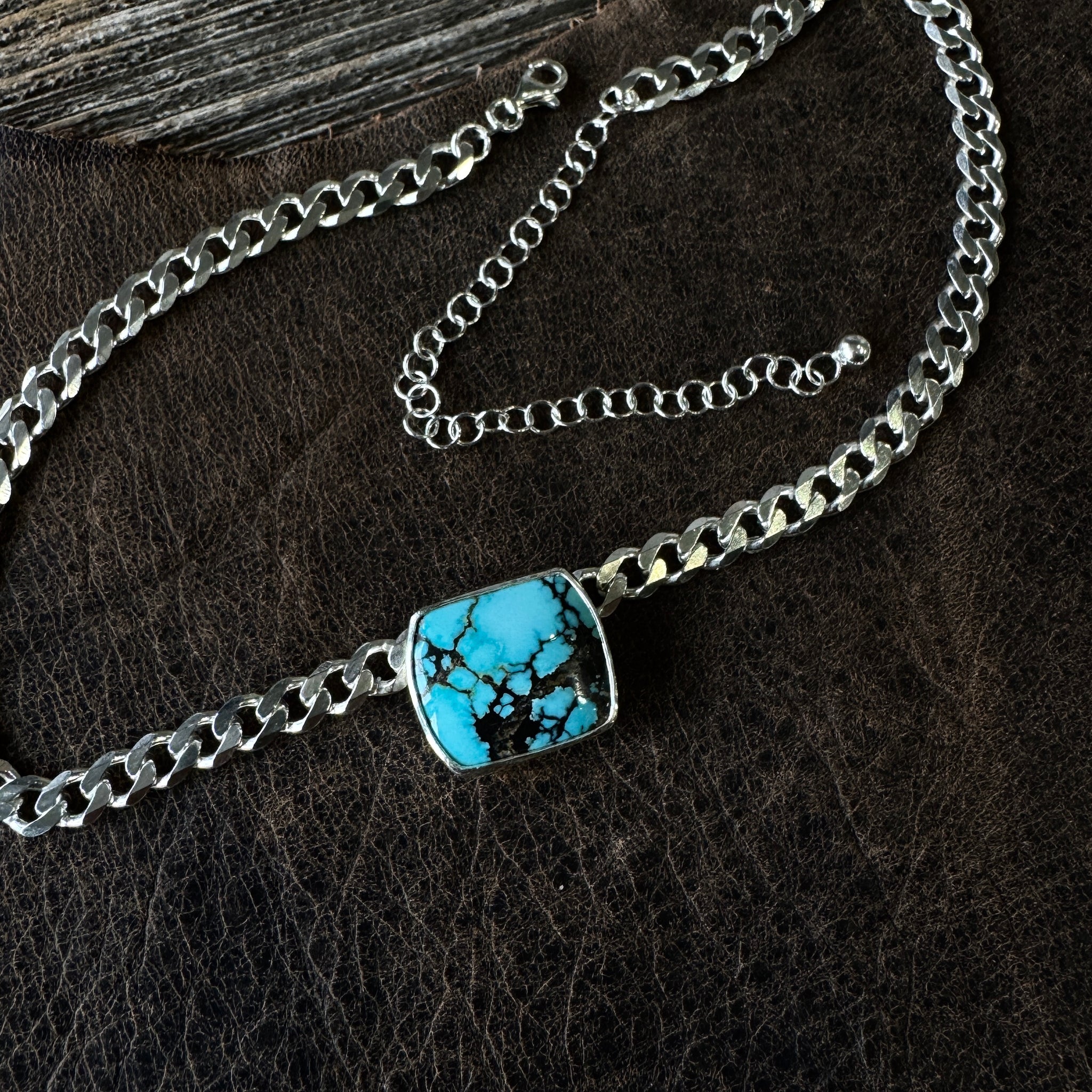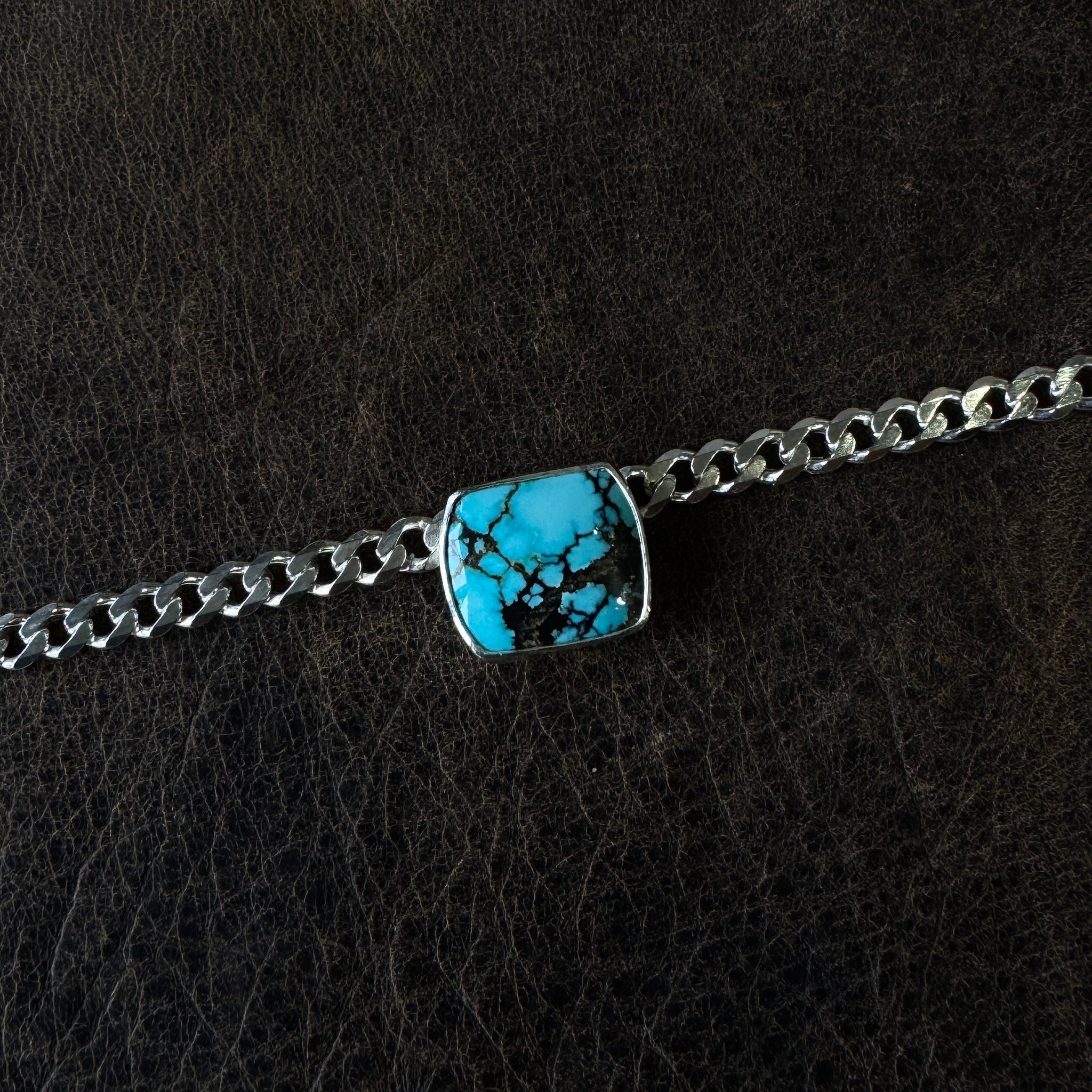 A BEAUTIFUL high-grade turquoise stone set in sterling silver on a chunky curb chain
