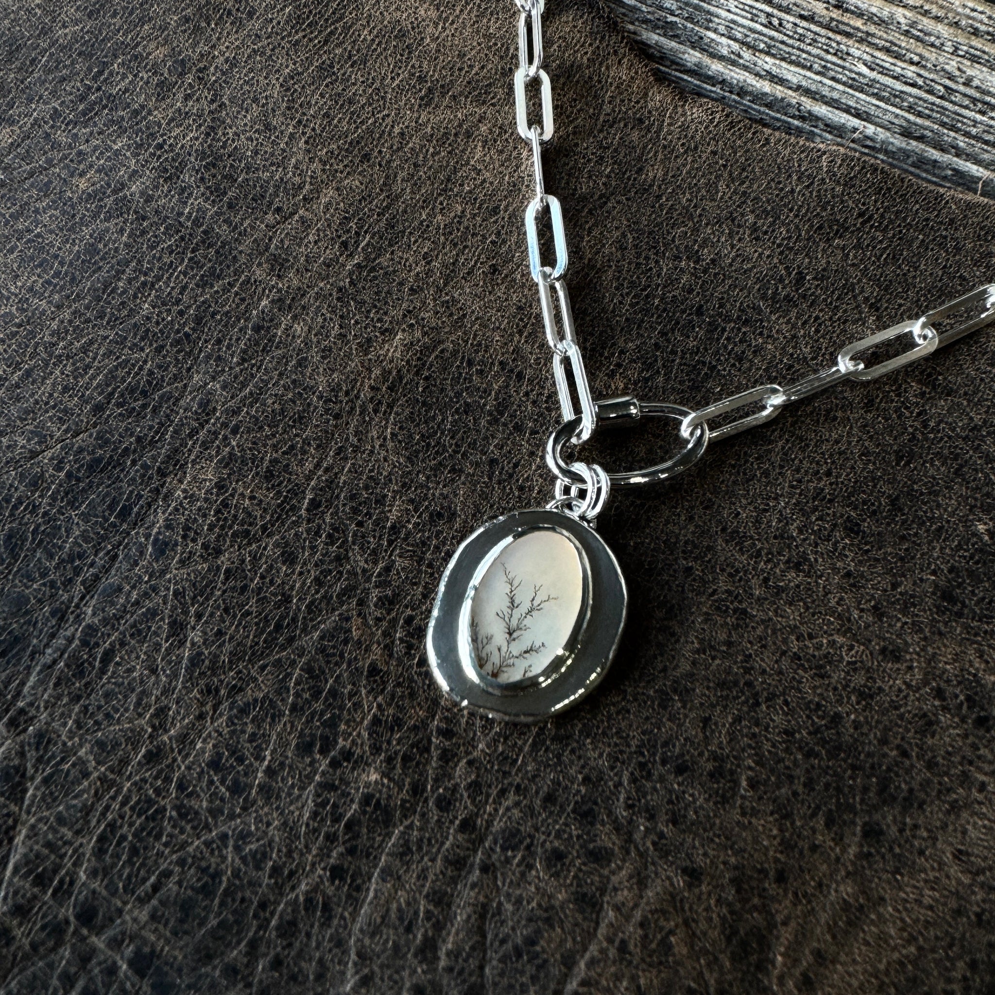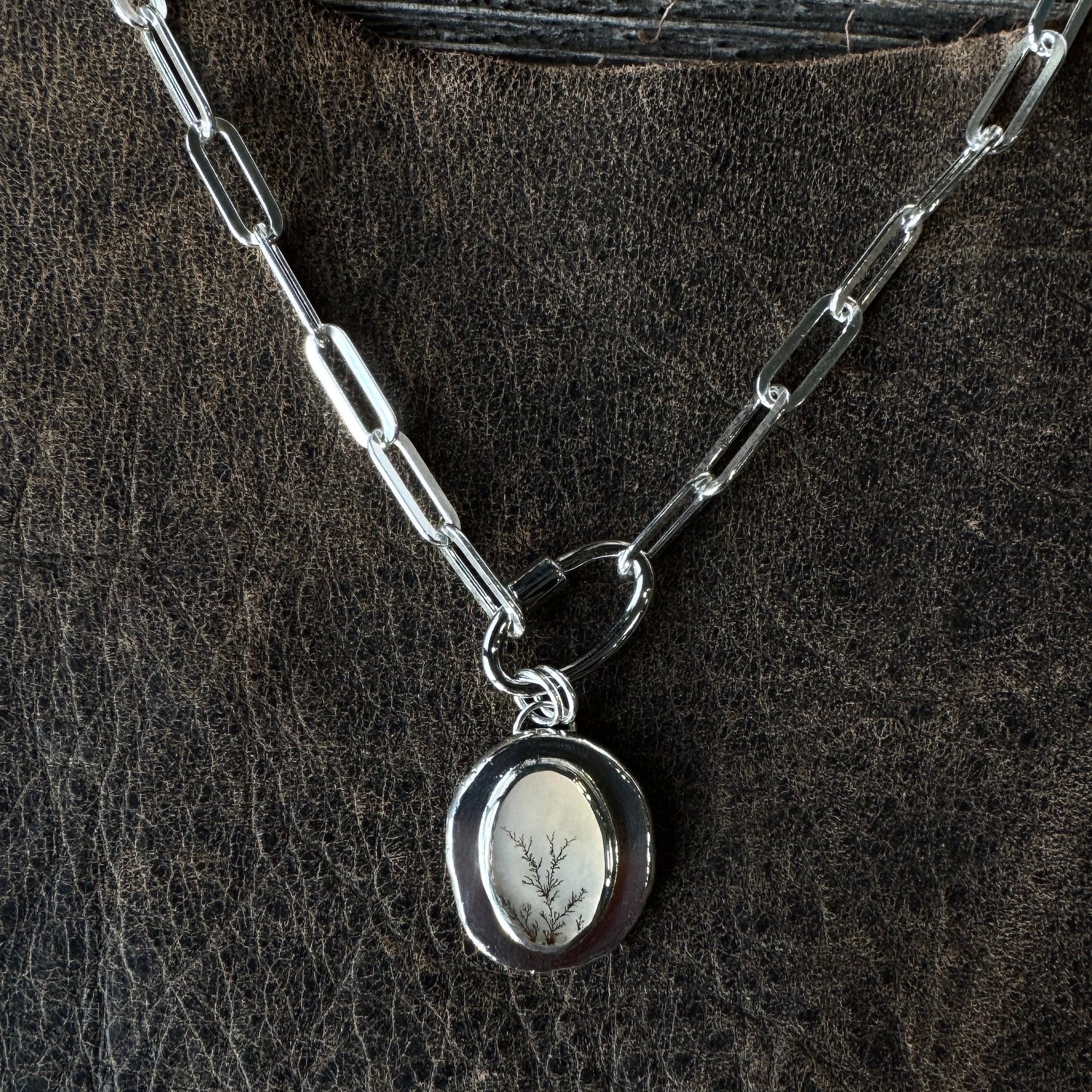 This necklace is crafted from reclaimed silver, melted down right here in my studio. Hand-hammered into a substantial backplate, it offers a presence and character that surpasses traditional sheet silver. Its unique roughness and imperfections embody the true essence of handmade jewelry, celebrating beauty not despite its flaws, but because of them. This collection is a tribute to my dad, who valued sustainability, durability, and the inherent beauty of reclaimed materials, in his case lumber. This collection holds a special place in my heart, and I am thrilled to share it with you!
