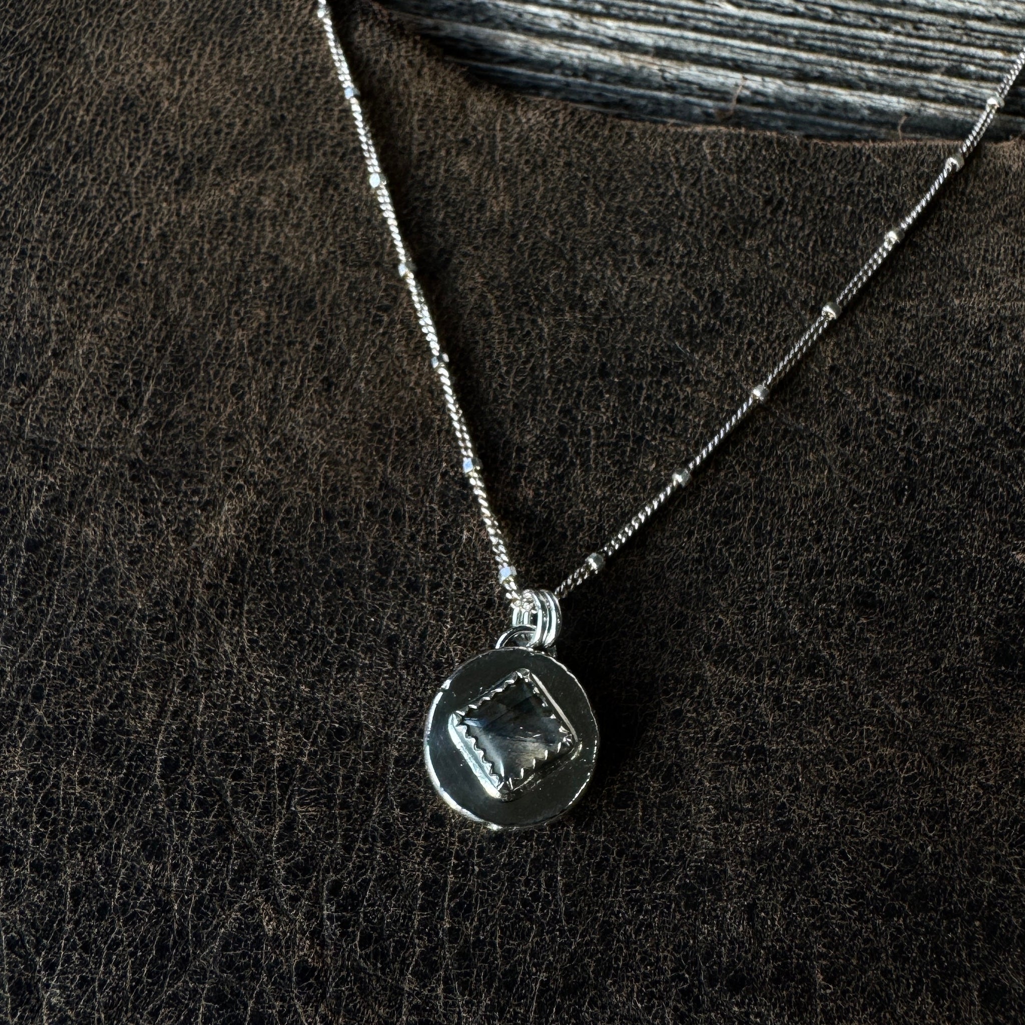 This necklace is crafted from reclaimed silver, melted down right here in my studio. Hand-hammered into a substantial backplate, it offers a presence and character that surpasses traditional sheet silver. Its unique roughness and imperfections embody the true essence of handmade jewelry, celebrating beauty not despite its flaws, but because of them. This collection is a tribute to my dad, who valued sustainability, durability, and the inherent beauty of reclaimed materials, in his case lumber. This collection holds a special place in my heart, and I am thrilled to share it with you!